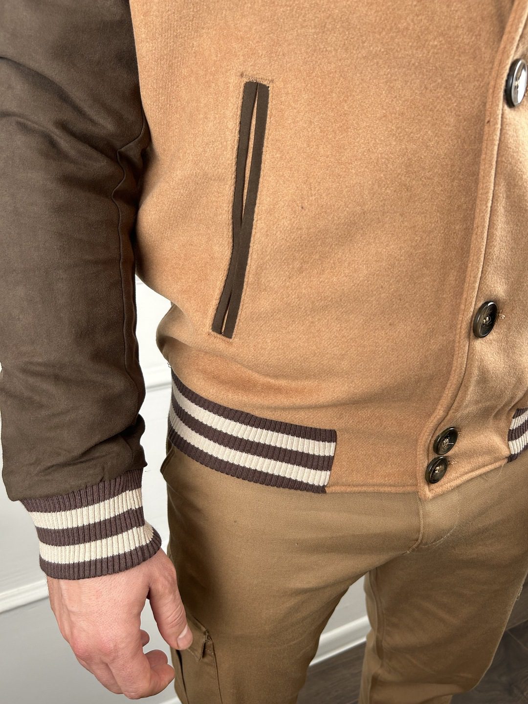 Kombinacija vune i viskoze pruža savršen balans topline i udobnosti, dok su rukavi od imitacije velura u istoj boji dodir koji jakni daje posebnu teksturu i stil. Idealno se kombinuju sa našim casual džeparicama za opušten, ali upečatljiv izgled.