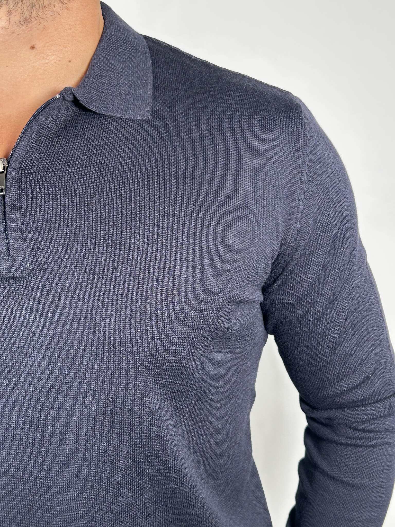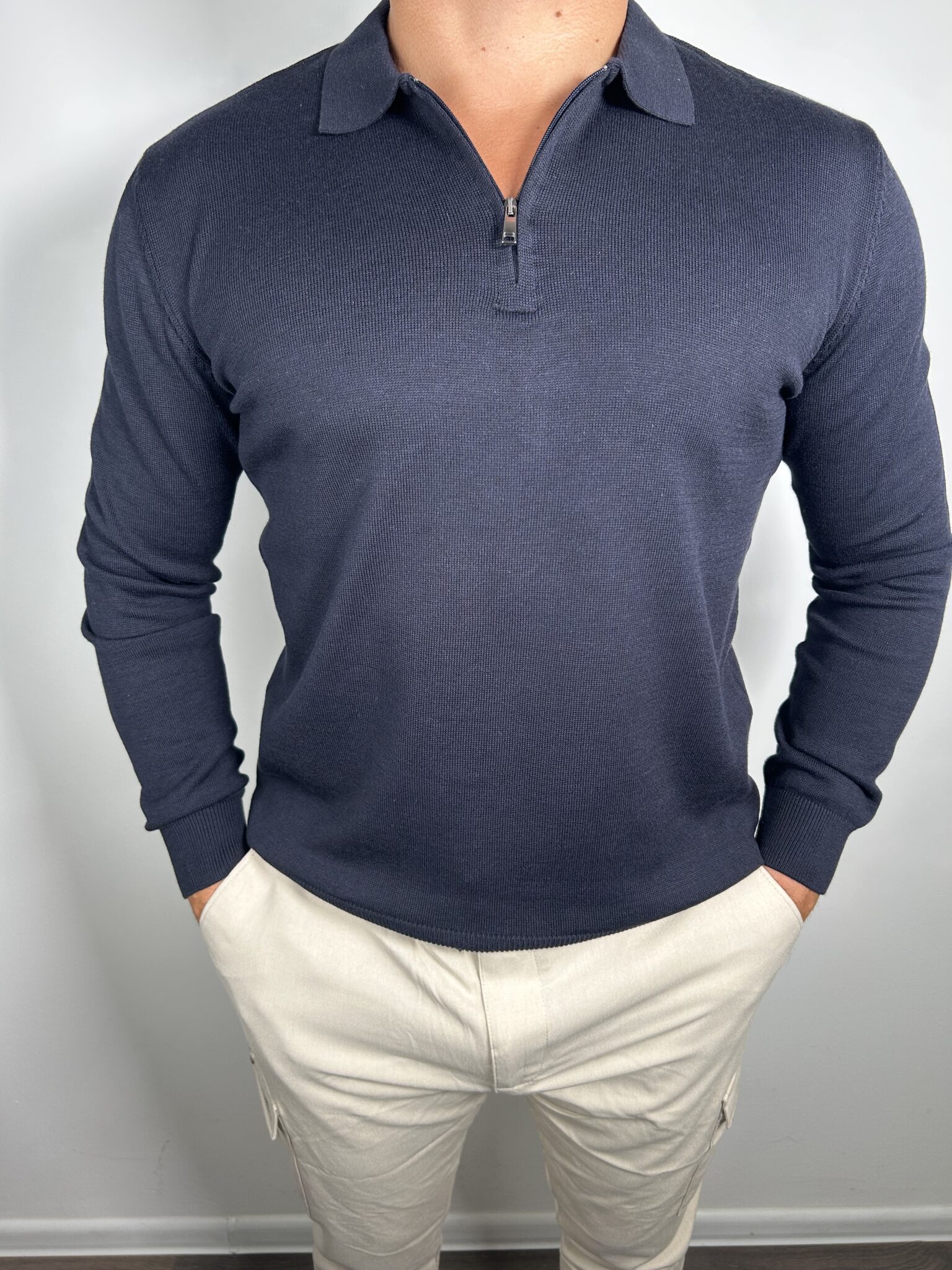 Ovaj pamučni džemper sa poluzipom u teget boji je savršen izbor za one koji vole klasičan stil sa modernim detaljima. Napravljen od prijatnog, visokokvalitetnog pamuka koji diše i prijanja uz telo, pruža udobnost tokom celog dana. Rajsferšlus do pola omogućava prilagođavanje stila – nosi ga zakopčano za ozbiljniji izgled ili otkopčano za opušteniju varijantu.
