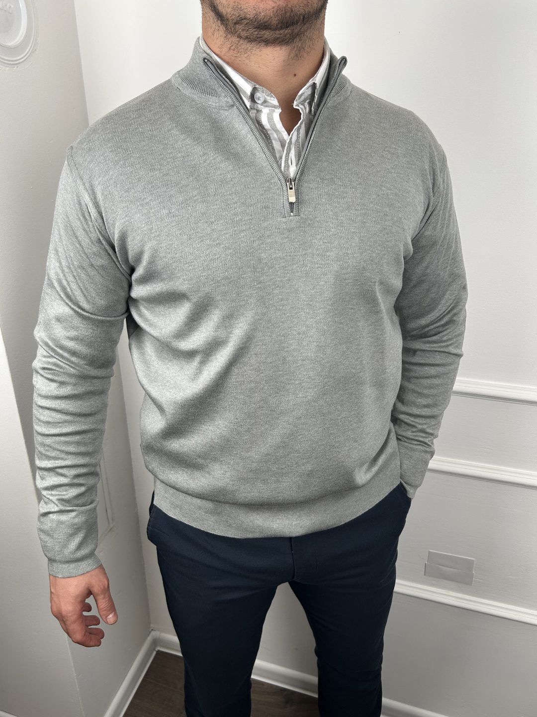 Izrađen od 50%vune i 50% konca, pruža prijatan osećaj na koži, dok podignuta kragna sa rajsferšlusom dodaje moderan i prefinjen izgled.
